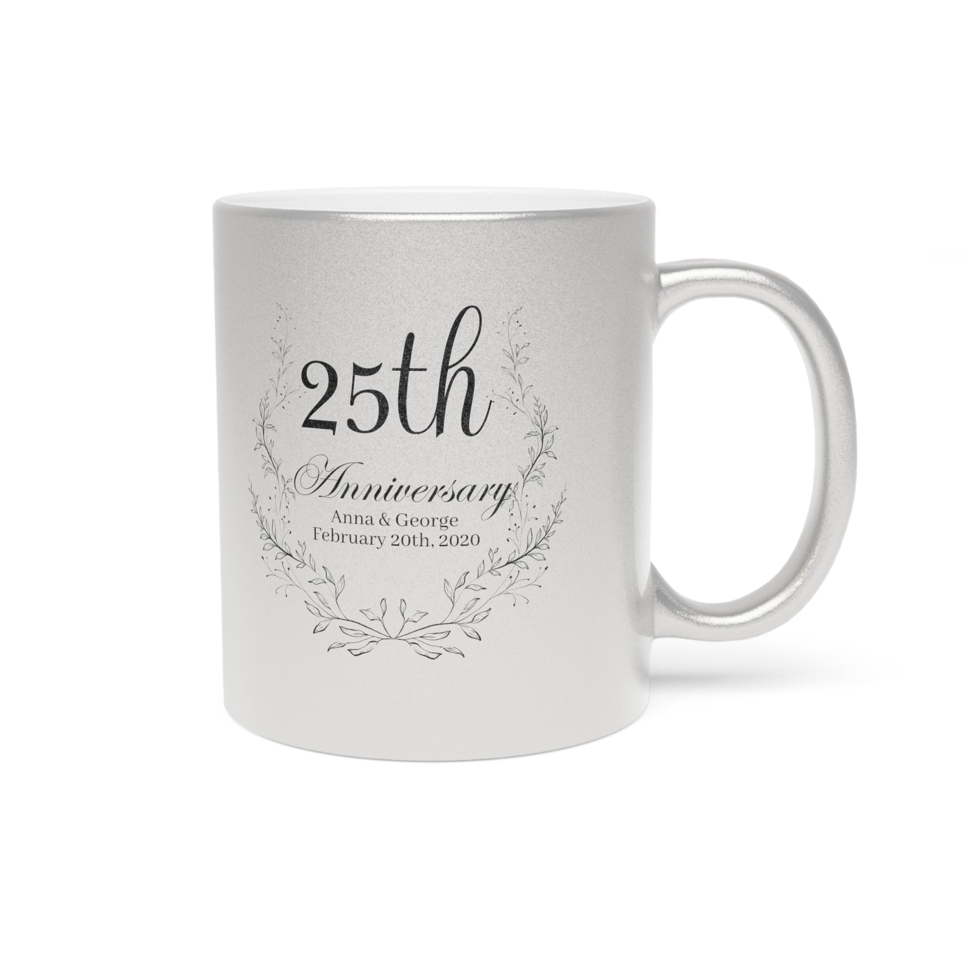 Celebrate a wedding anniversary with this elegant Gold or Silver metallic-coated ceramic mug. Perfect for gifting to a special couple, adding a touch of luxury to their morning coffee or tea routine. Ideal for anniversaries, Valentine's Day, and special occasions.