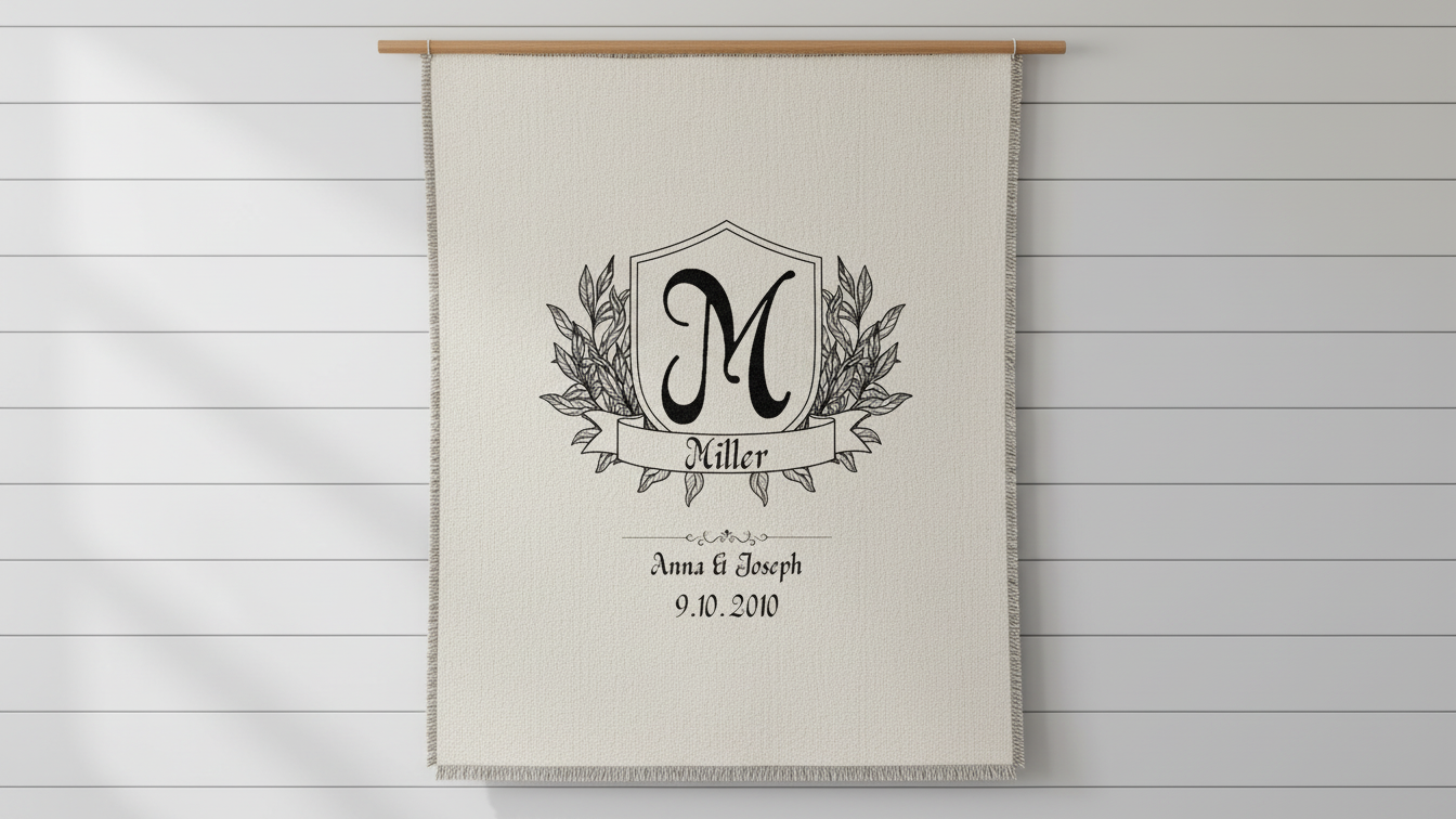 A warm, woven cotton blanket that brings a quiet, vintage charm to living rooms and reading nooks. The design features a delicate monogram framed by botanical flourishes and subtle text. Soft, colorful fringed edges and visible woven threads give this blanket a handcrafted, tapestry-like feel. Available in three sizes, it layers easily over sofas, footstools, or the end of a bed to add a cozy, curated touch to daily life.