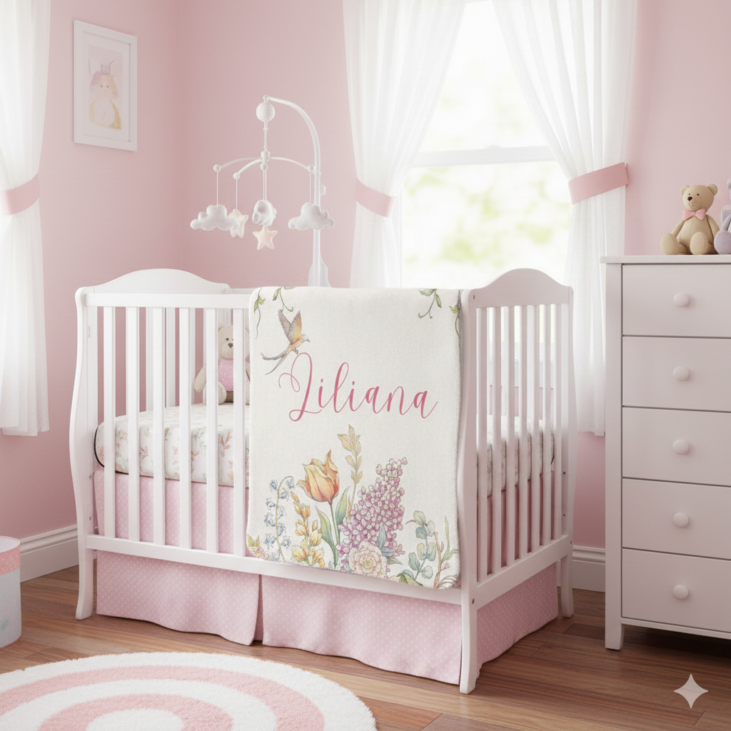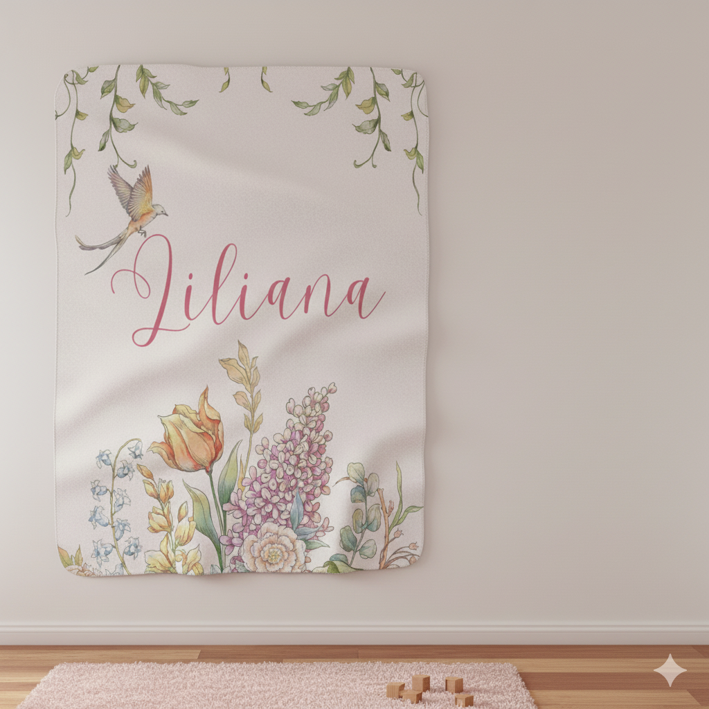 A whisper-soft sherpa fleece blanket that reads like a gentle garden letter. Watercolor wildflowers and a tiny hovering bird frame a hand-lettered name, making afternoons on the sofa slow down. The plush sherpa back cocoons you in warmth while the smooth printed face shows delicate pastel blooms and trailing vines. It settles around shoulders during quiet mornings with coffee, tucks over little knees at story time, and drapes across a guest bed to add a personal, lived-in touch. Lightweight enough to carry to picnics yet cozy enough for chilly nights, this blanket brings a calm, botanical presence into everyday moments.
