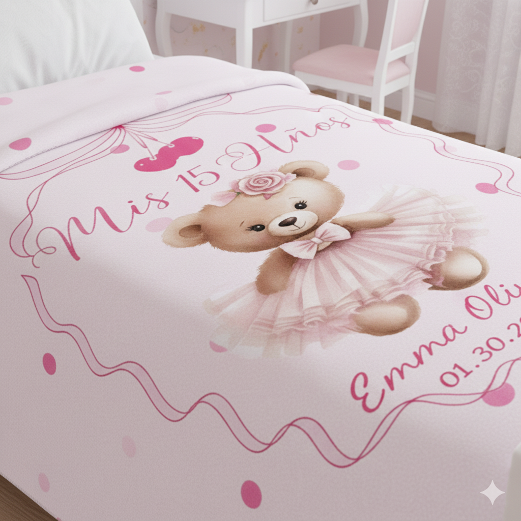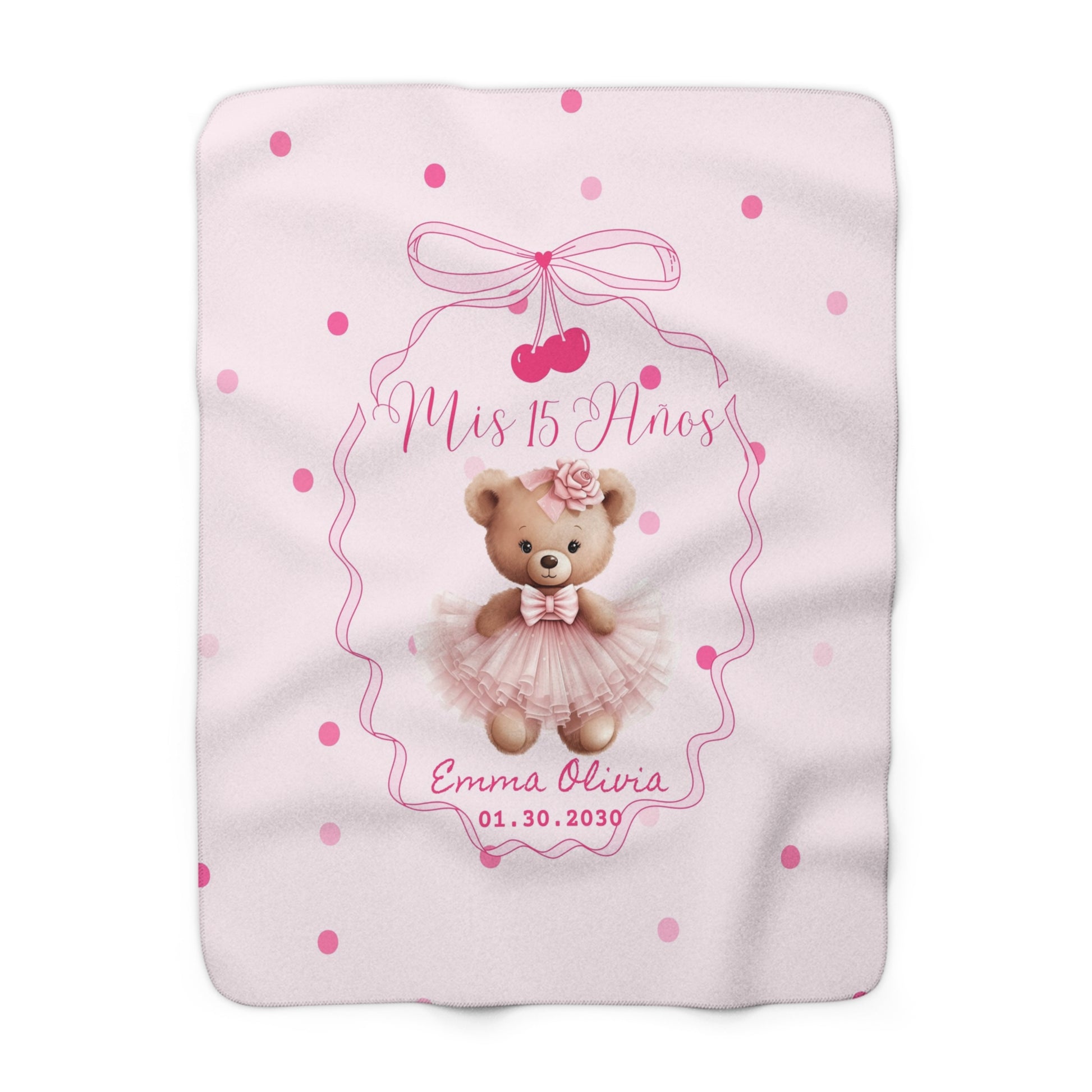 Teddy Sherpa Blanket – Custom Name & Date, Pink Polka Dot Quinceañera Gift