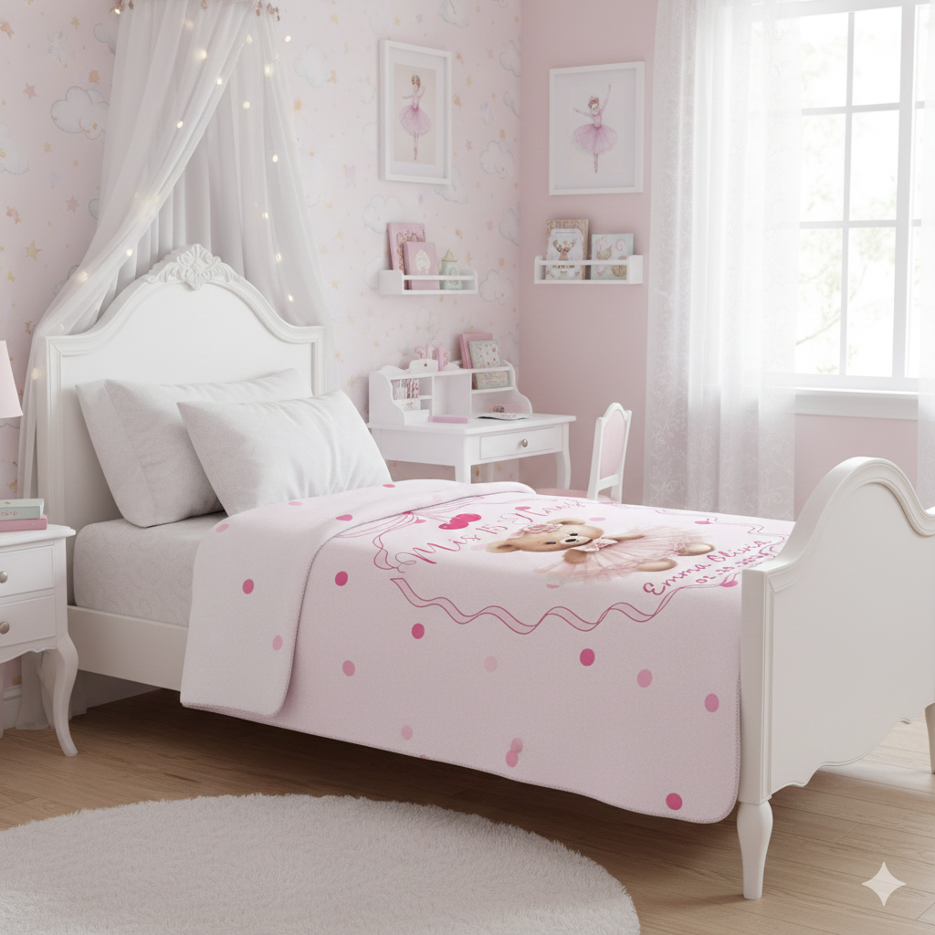 Wrap them in a soft, storybook moment. This sherpa fleece blanket pairs a velvety printed front with a plush cream sherpa back to create a snuggly layer that feels like a warm hug. The design—delicate pink polka dots, a ballet-dressed teddy, and hand-lettered script—evokes a quiet celebration and gentle nostalgia. It sits perfectly on a nursery chair or draped over a couch, ready for slow afternoons, memory-making gatherings, and photo moments that linger. Lightweight yet warm, it comforts without weight and wears well through cozy nights and repeat cuddles.
